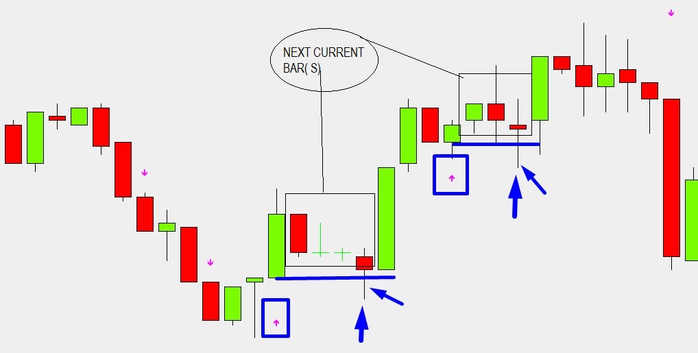 if the next bar (s) Low price < arrow bar close price && current bar close price >Low price