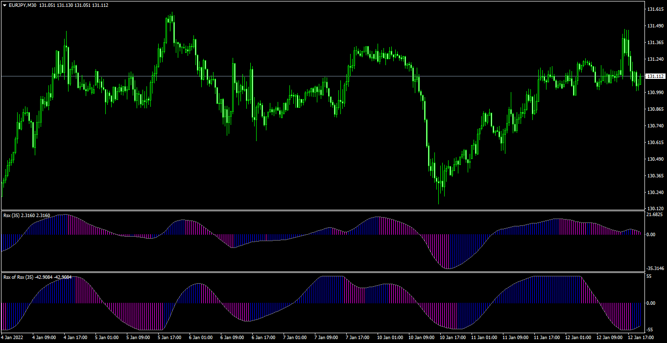 Two different Rsx calculations using different lengths to allow trading of retracements as well as longer-term positions.