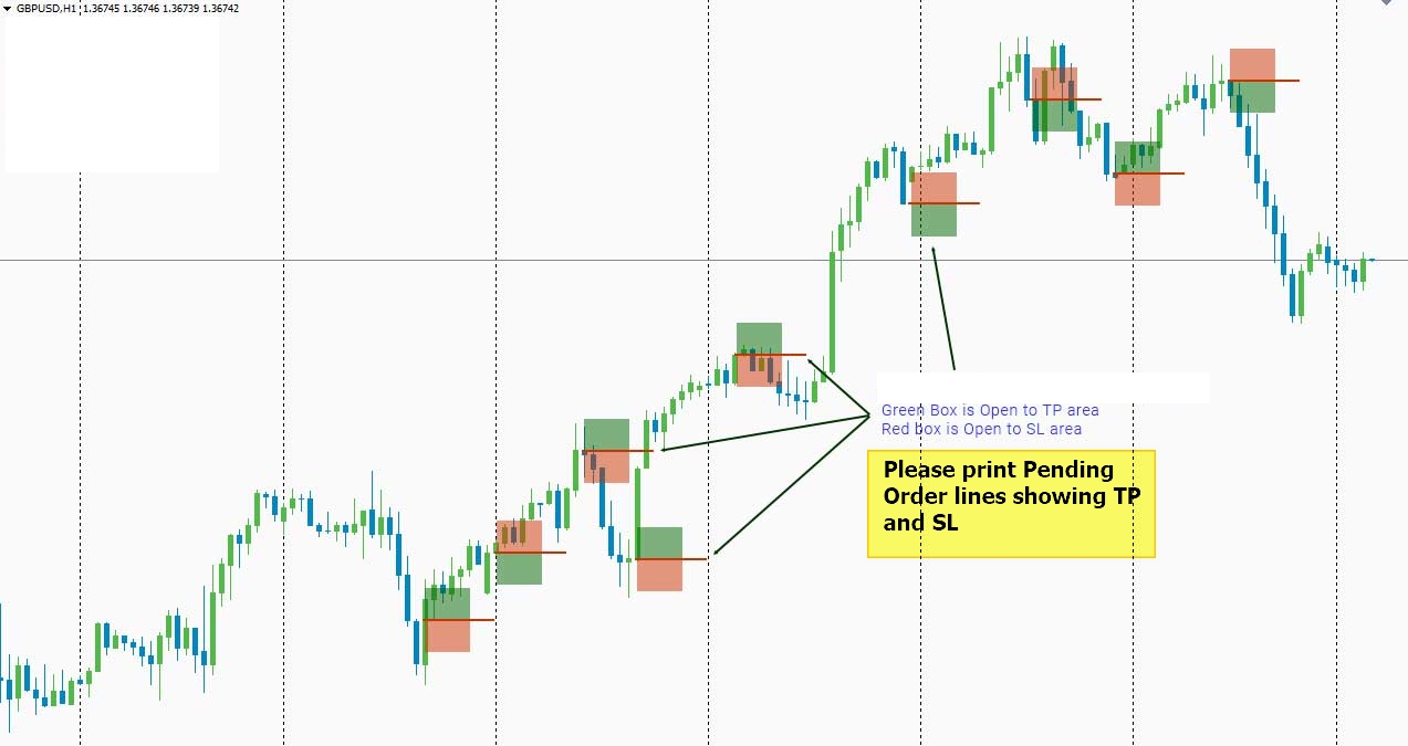 I am attaching a picture. It may also be good for retirees to see pending orders mini grid visually with TP market. For grid trading only Equity Loss will be there. Not SL for each mini grid. Mini grid will reopen TP though. Erroneously, it is showing SL for mini grid, which is not supposed to be there. Only Exit is either by TP at top or by Equity Loss at bottom. If you don't remove the EA or don't specify the cycles, it will keep activated as long as it remains on.