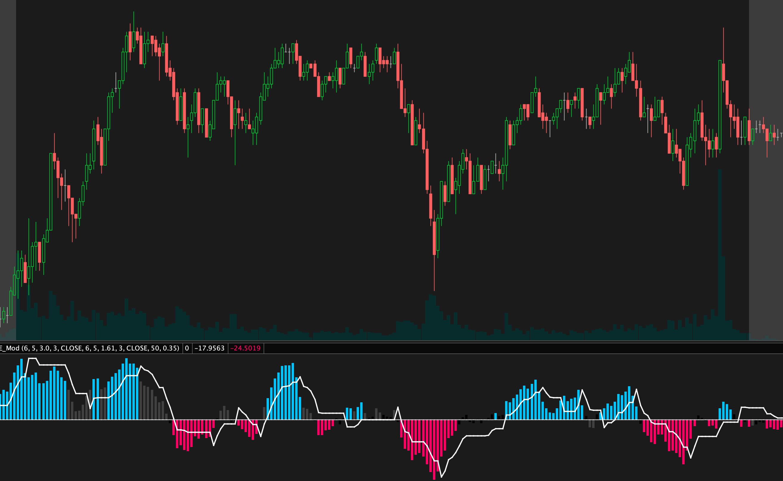 The indicator consist of two QQE's, one that you can see on the screen, and one working in the background with a 50 MA Boillinger Band acting as a zero line. When both agree you get a blue or a red bar.