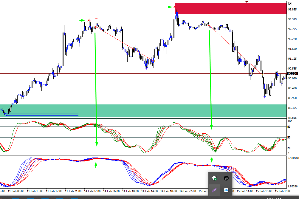 Crude 15M.... The trades are a few days old so the fractal OBs are gone..... Newer ones develop as the market makes new highs and lows..... However, at that time with the indicator settings confirming my bearish bias, the Sell entries were spot on...... The small dash in red above price and blue below show the reward to risk aspect of the trades.
