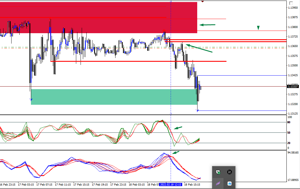 Currencies are most commonly a mess...... You may see the OBs forming and mitigating in endless succession.... However, the rejection from the SD zones, formation of new OB, Retest of the block, then final indicator confirmation made the trade seem pretty straight forward. At the place where I have put a vertical blue dotted line on the chart there was no doubt in my mind that the pair is most likely to plummet..... the same squeeze was equally evident on 30M and Hourly chart.... At the moment, the trade is breakeven and perhaps around 2-3R in profit. From this trade it may be clear to you why one can't trade alone based on OBs and Zones.... The spikes up and down would kill your trade.... The indicators windows is the life line which keeps the trade alive in the most uncertain market conditions.