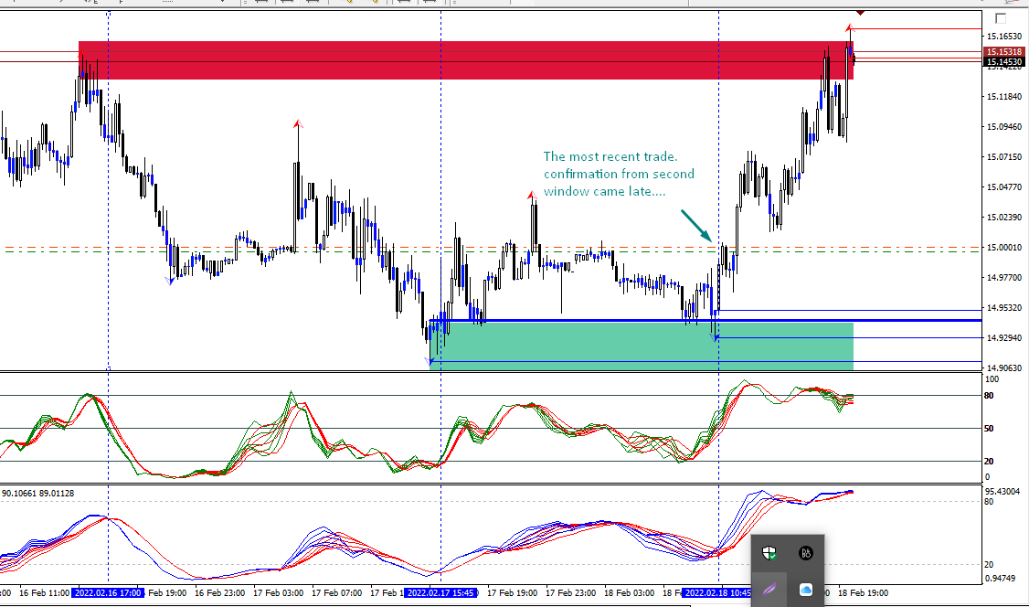 Name an instrument and I will either show you a live running trade or clear signals on the chart where the entries are self-evident with the strategy. The SD zone, The OBs, and the final indicator signal..... My latest trade seemed late to me, but needed to confirm it with the 2nd window indicator signal........ Current market price seems like I have made something like 2.5R.... The second fractal OB on top of the first is kind of sweet, you could have taken it right there, but that would have been a bit too early given that the cross on the indicator window was not confirming it....