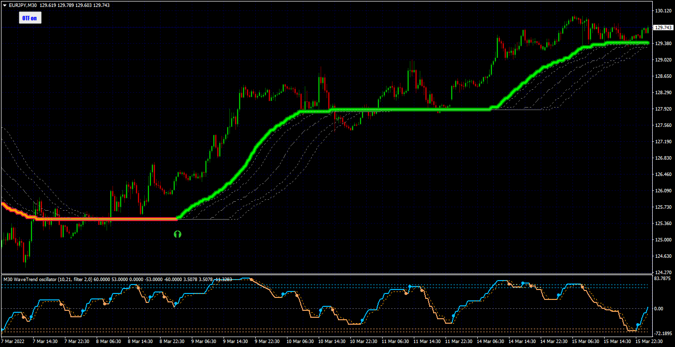 1. If the lowest price of candles is greater than the signal line (ie green + thick yellow line), the candles are drawn in green;