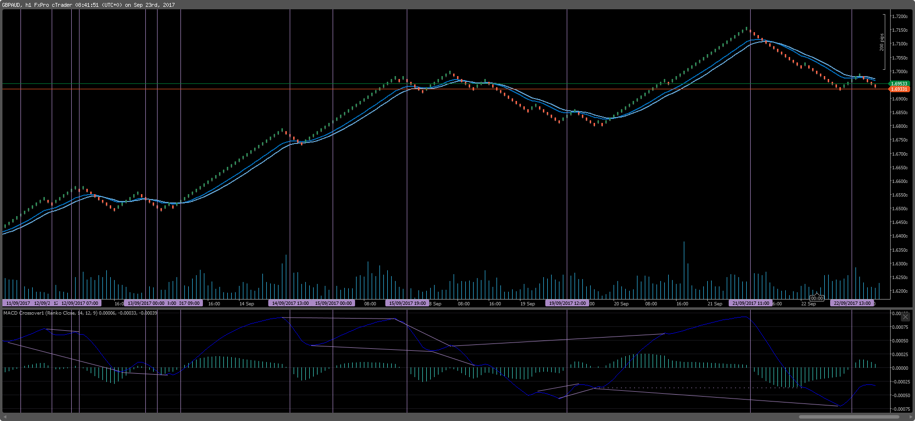 Ok, this Renko indi has obviously a repainting problem on cTrader (when reopened the chart) and the market just stopped, but I hope you see, that the SL can be set very tight and when it is hit you just open a position in opposite direction, because it breaks through with an impulse. So you have a small lose and a big win on the other side.