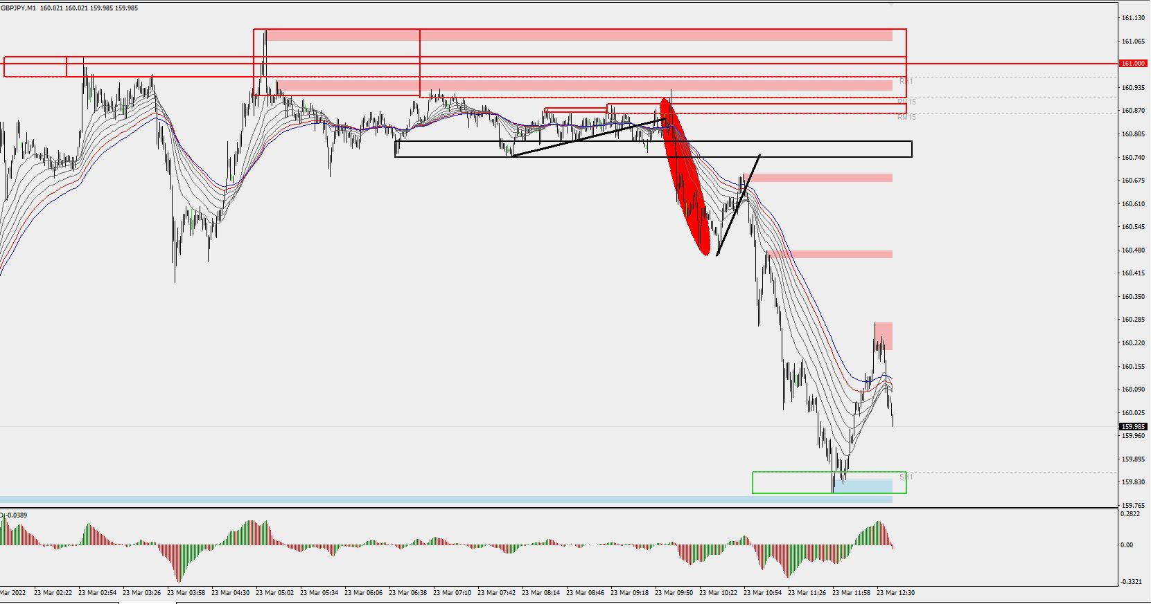 lots of chop around the 161 level, multiple SD zones, price can not break it. Fast and furious move down (impulse), MA's widening/momentum, retrace, entry on trendline break.