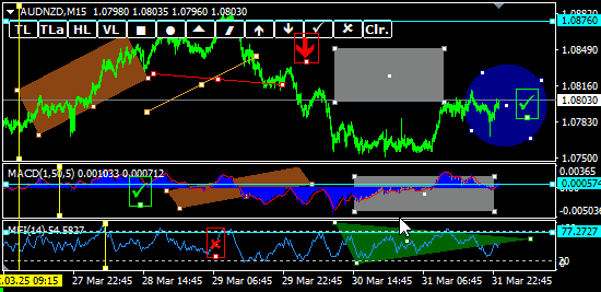 - trendline, trendline by angle, horizontal line, vertical line, rectangle, circle/ellipse, triangle, channel, arrow up/down, check/cross