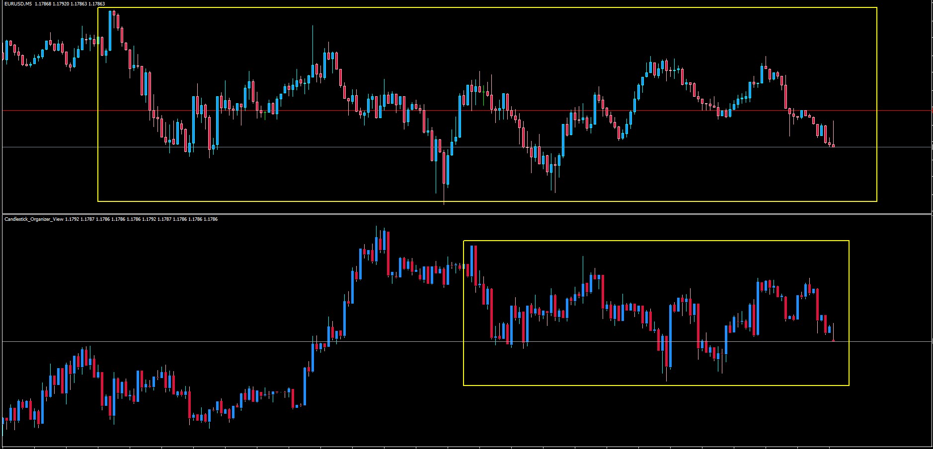 Doing this candlesticks organizer in MT4 was quite challenging. A replica of the chart candlesticks was made in a subwindow and then the "new chart" was generated following these rules: