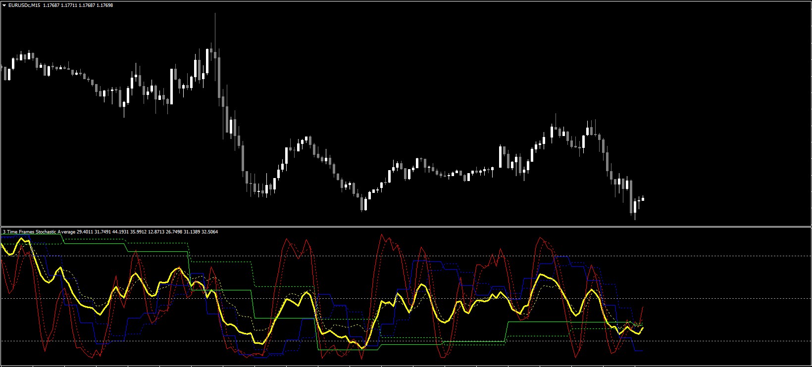 This indicator will create an average stochastic with its signal line from 3 different time frame's stochastics.