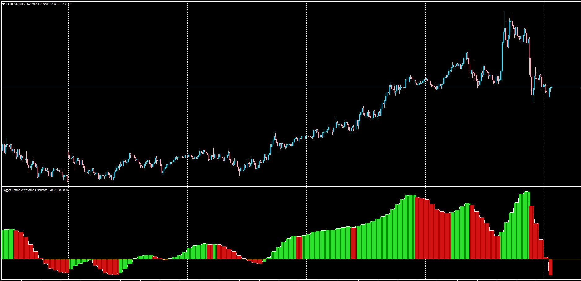 MT4 version of the LUA Original BF AO in which the awesome oscillator of a bigget time frame is displayed on the current chart. The green/red colors in the histogram represent the slope of the oscillator.