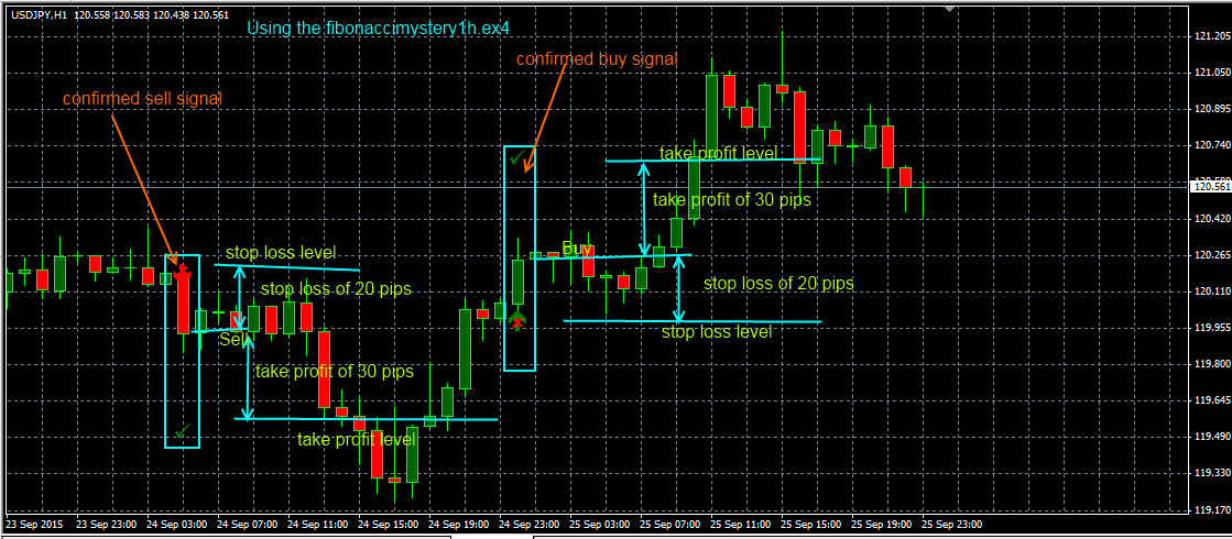 When trading with the fibonaccimystery1h.ex4, you should consider using a take profit of 30 pips and a stop loss at the previous lowest point. But if there is no lower point in the previous day, use a stop loss of 20 pips.