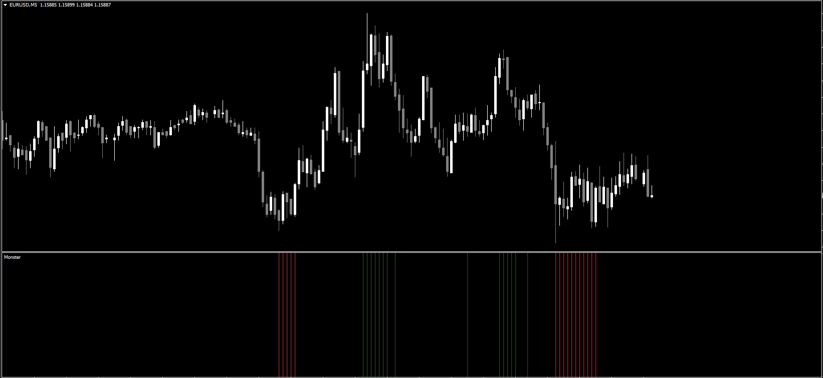 Monster indicator is located in the basement of the price chart in the form of a histogram built on the interaction of three indicators: