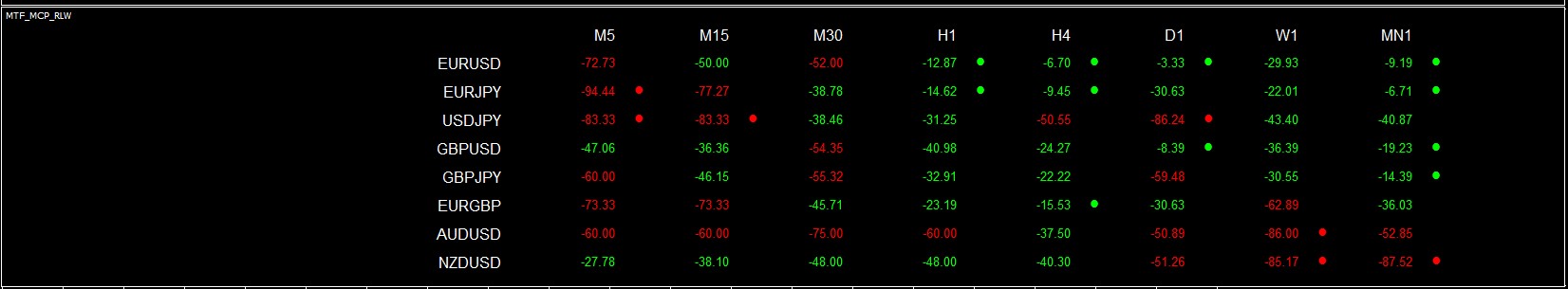 In addition, if the WPR in a particular currency pair and time frame is above the OB level or below the OS level, a colored dot will be placed next to the WPR value.