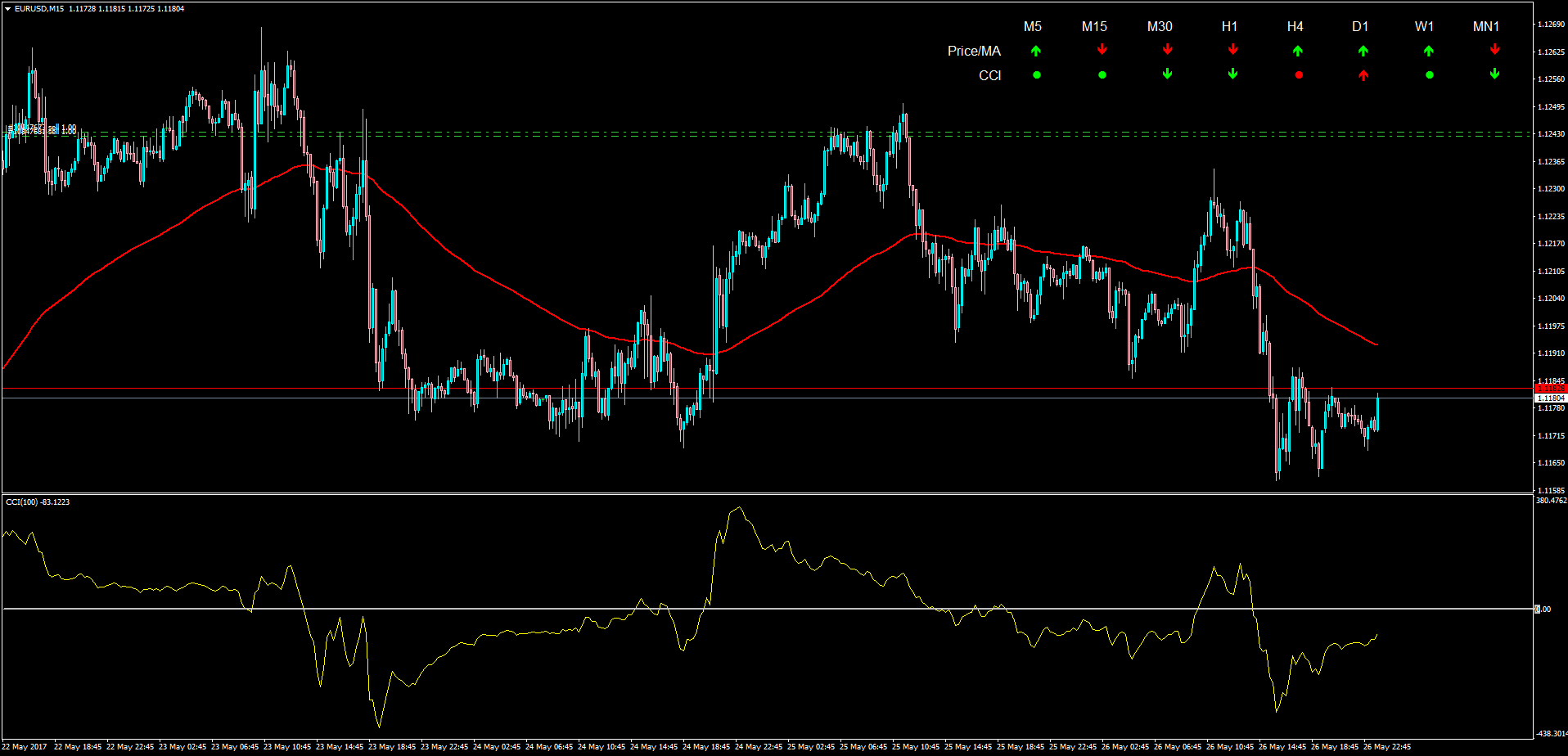 - Down Arrow means price below MA and CCI below selling level