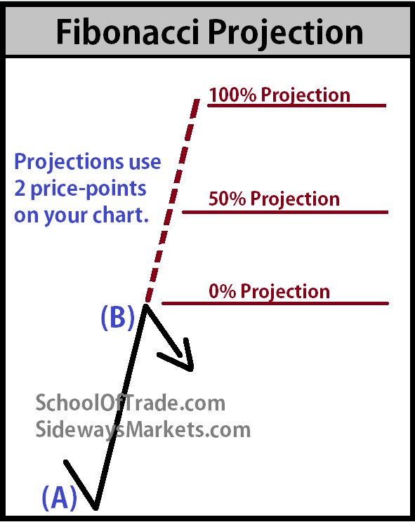 Fibonacci projection is a measurement from 2 points on a chart, and the range between these two price points is then 'predicted' in the future to be used as support and resistance.