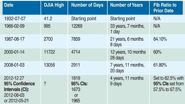 - Up to the present time, at each time point on the Fibonacci spiral, each subsequent point has reached a higher high, each increment was less and less in percentage terms than the previous movement. Exceptions were 1966 and 1987 (for example, DJIA = 40 in 1932 to DJIA = 995 in 1966 in relation to any other period under consideration - an increase of about 44 times during this time period).