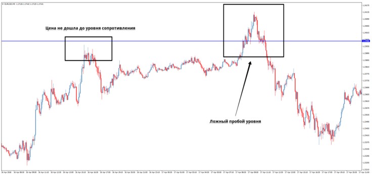 In the first case, it would be possible to open a deal for sale on the rebound from the resistance level, but the trader did not do this, as the price did not reach the level drawn by him. In the second case, a long transaction would be opened for breakdown of the level. In the best case, it would bring a very small profit or would close on the gapless. At worst, the deal would bring a loss.