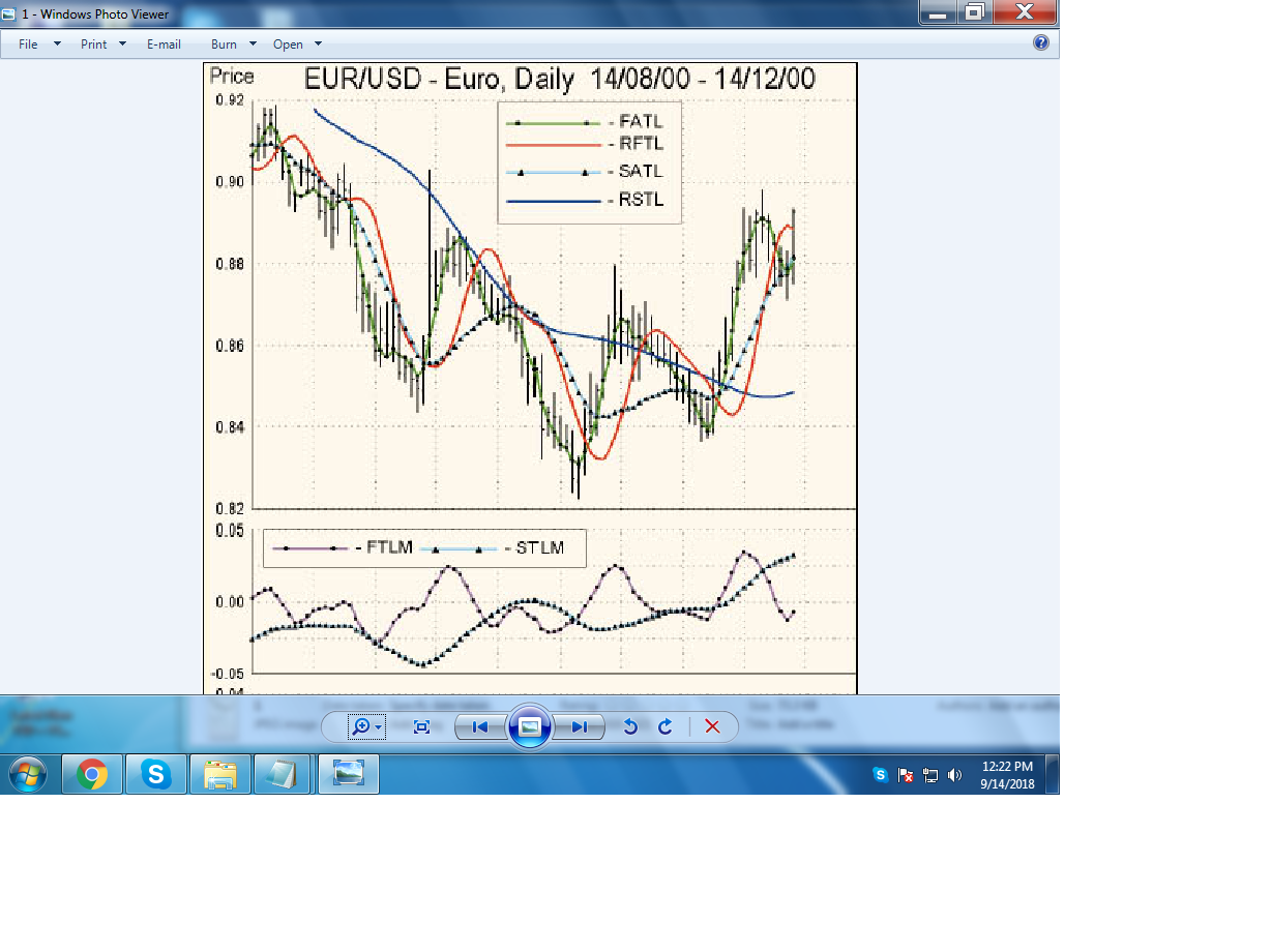 These filters parameters (frequency of cutting fc and fading A in the stop band) were calculated with spectral estimate of the currency rate EUR/USD. Filters of low frequency FLW –1 and FLF – 2 provide attenuation in the stop band with no less than 40 dB and absolutely don’t distort the amplitude and phase of entry discontinuous price series in the pass band (bandwidth). These properties of the digital filters provide significantly improved (in comparison with simple moving average) noise suppression that in its turn allows reducing sharply the probability of appearance “false” signals for purchase and sell.