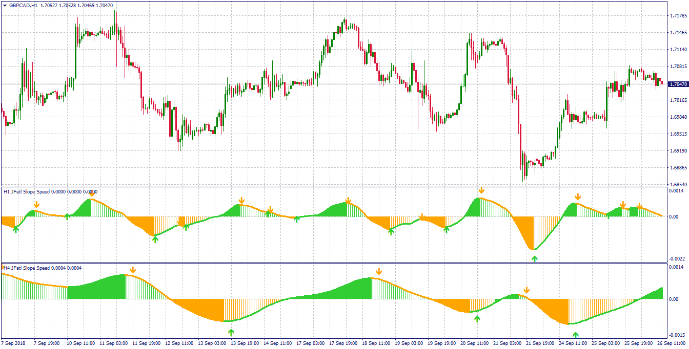 Try keeping display main trend line (the white one in my picture) for to better understand slope coloring,so the arrows on zero cross and or on slope change