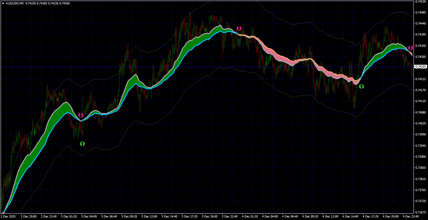 2. Need alert and arrow whenever price touches or moves out of boundary whilst respecting the trend (Green and red middle band of MA Crossover) Hope its possible.