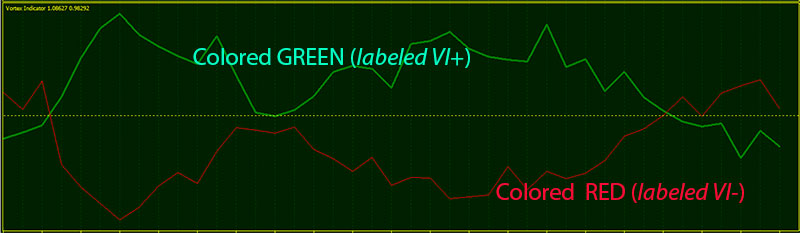 The Vortex Indicator is composed of two lines–typically colored GREEN and RED, and labeled VI+ and VI-, representing up moves versus down moves.