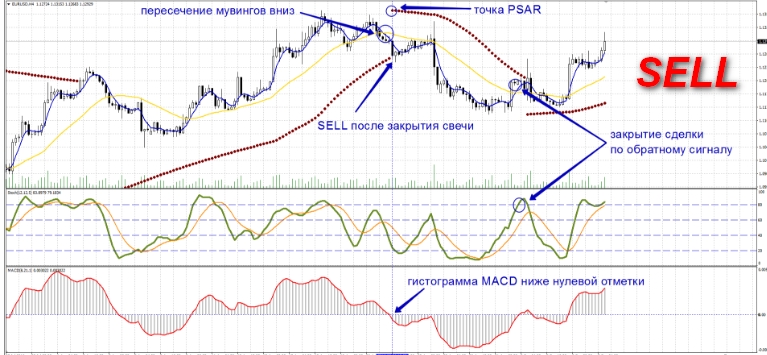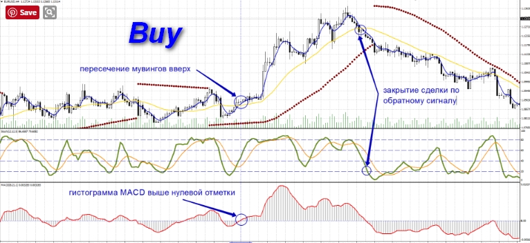 Allowed to open a deal to BUY, only if on the chart there is a point "support» ParabolicSAR. A situation may occur that the moving averages crossed in the opposite direction from ParabolicSAR, and the point came later. In this situation, you can also enter into trading positions if Parabolic SAR dot appeared no later than within five candles since crossing Moving Averages. Accordingly, if there was a point ParabolicSAR not - miss a deal.