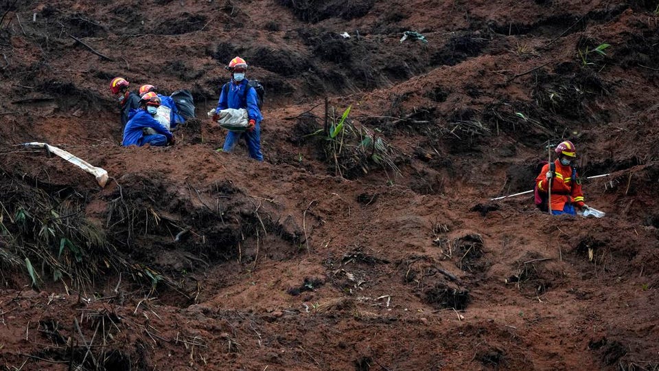 Emergency workers carry items after conducting a search operation near the China Eastern crash site. ... [+] ASSOCIATED PRESS