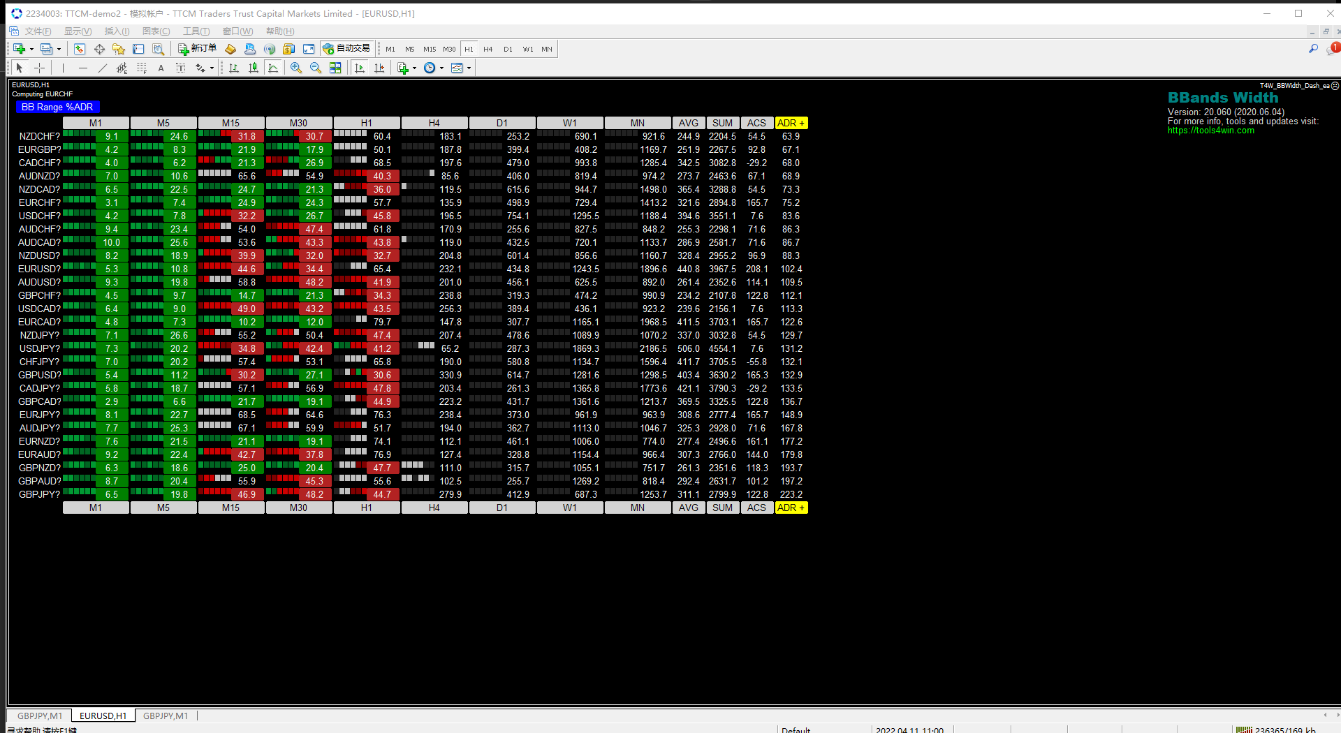 hows informations of multiple Bollinger Bands Width indicator for all Forex major and cross pairs and different timeframes. Many features are available.