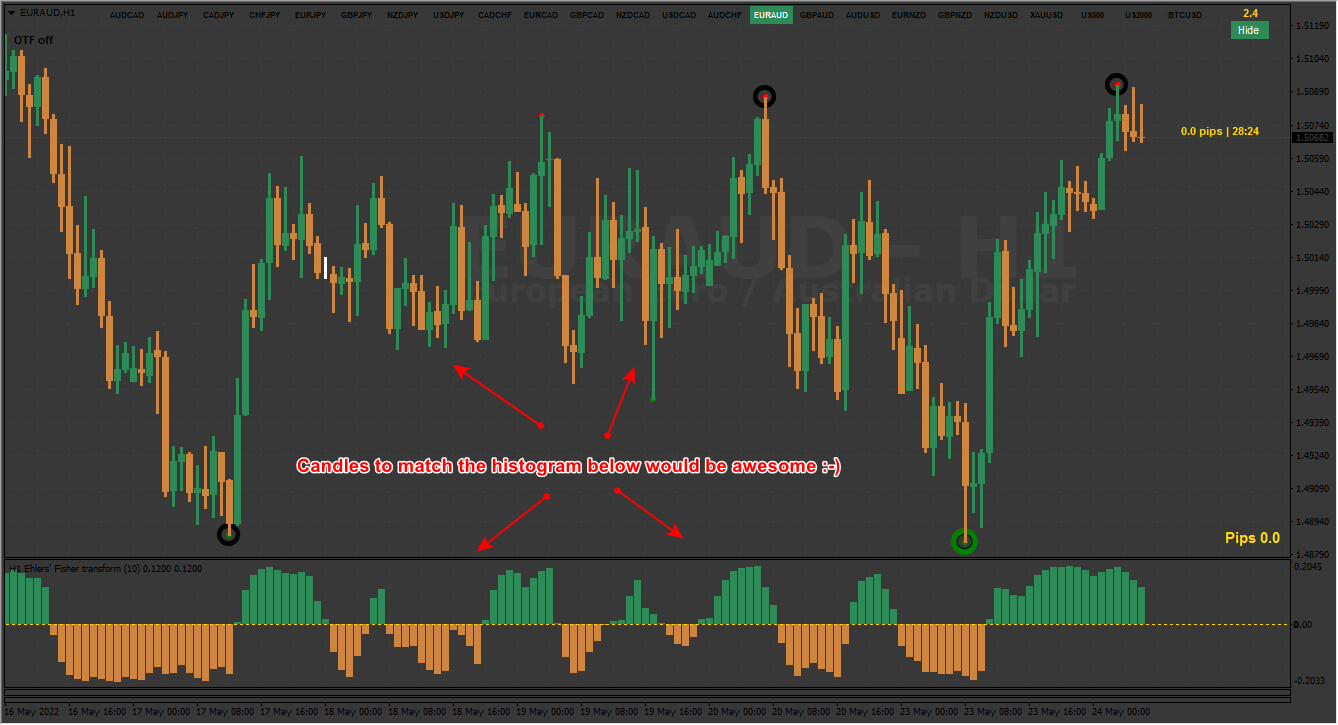 Could the EFT Histogram indicator below have an additional "display candles" option added to match the colors and bars of the histogram? Candles to be auto adjusting as well to match the width of the histogram bars