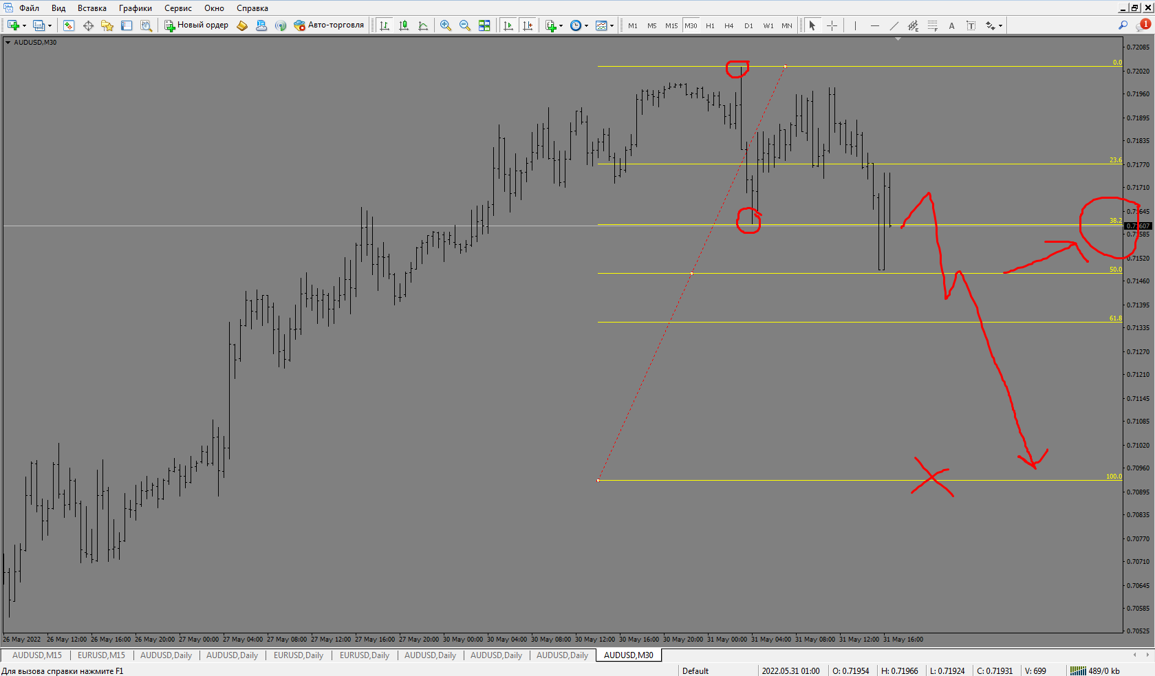 On one of the forums, I saw a way to set Fibo lines when the extremum of the first impulse is 38% of the upcoming movement.