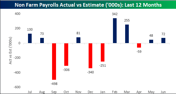 Over the last year, the average miss in NFP has been 291K while the average beat has been just 143K.