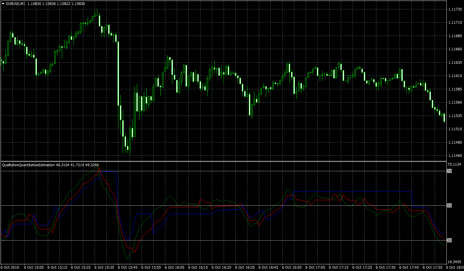 I downloaded the QualitativeQuantitativeEstimation.mq4 file from this website, and the indicator is supposed to look like the above.