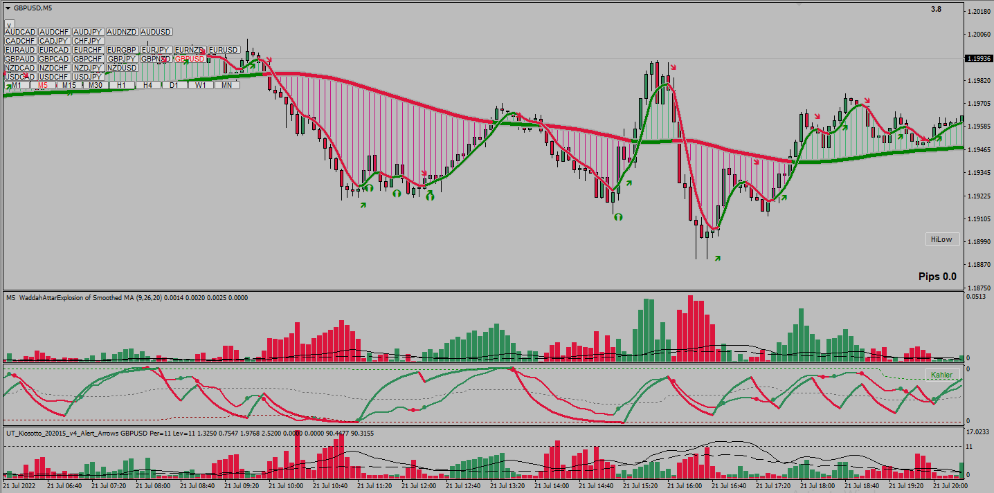 The Kiosotto looks just like the waddah attar explosion but the calculation is very different. However, as in the waddah attar explosion, I added a dashed ATR DeadZone (dz) line and a solid Standard Deviation x Band Deviation explosion line adjusted for the scale of the main Kiosotto bars. Those lines work in the same way as the same type of lines in the waddah attar explosion indicator. When the histogram bars are below the ATR DeadZone that shows low volatility and when the bars are above both the ATR DeadZone and the (Standard Deviation x Band Deviation) explosion line, that shows a volatile move. When that volatile move exceeds all three lines, the ATR DeadZone, the (Standard Deviation x Band Deviation) explosion line and the Alert Level line, then it's a sign that the move is extreme so a reversal is imminent, then when it's time to actually open a reversal trade the reversal entry arrow in a circle will appear. However, a reversal entry arrow is only valid if the waddah attar explosion bars color is in the direction of the trade and are above their ATR DeadZone and (Standard Deviation x Band Deviation) explosion lines. Furthermore, at the time of the reversal trade entry signal, the pips distance between the price and the slow XU moving average must be big enough for entering the trade to make any sense.