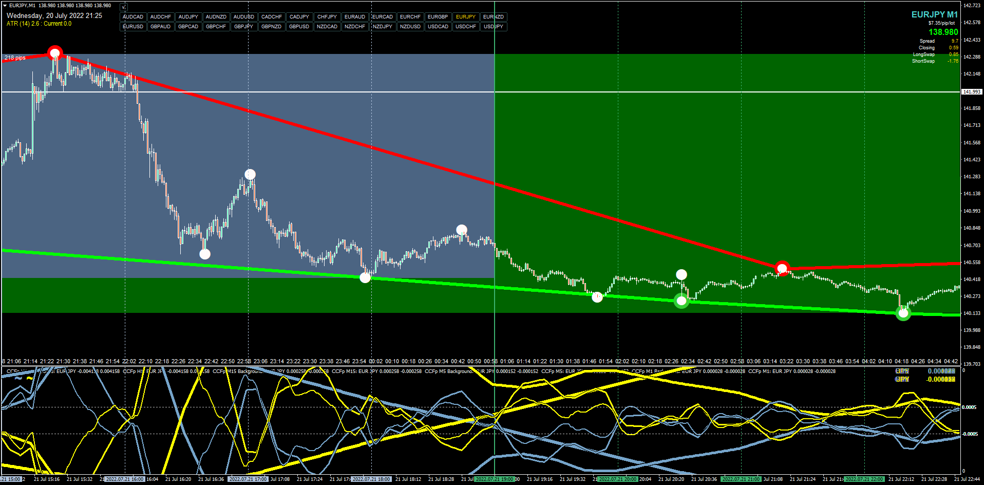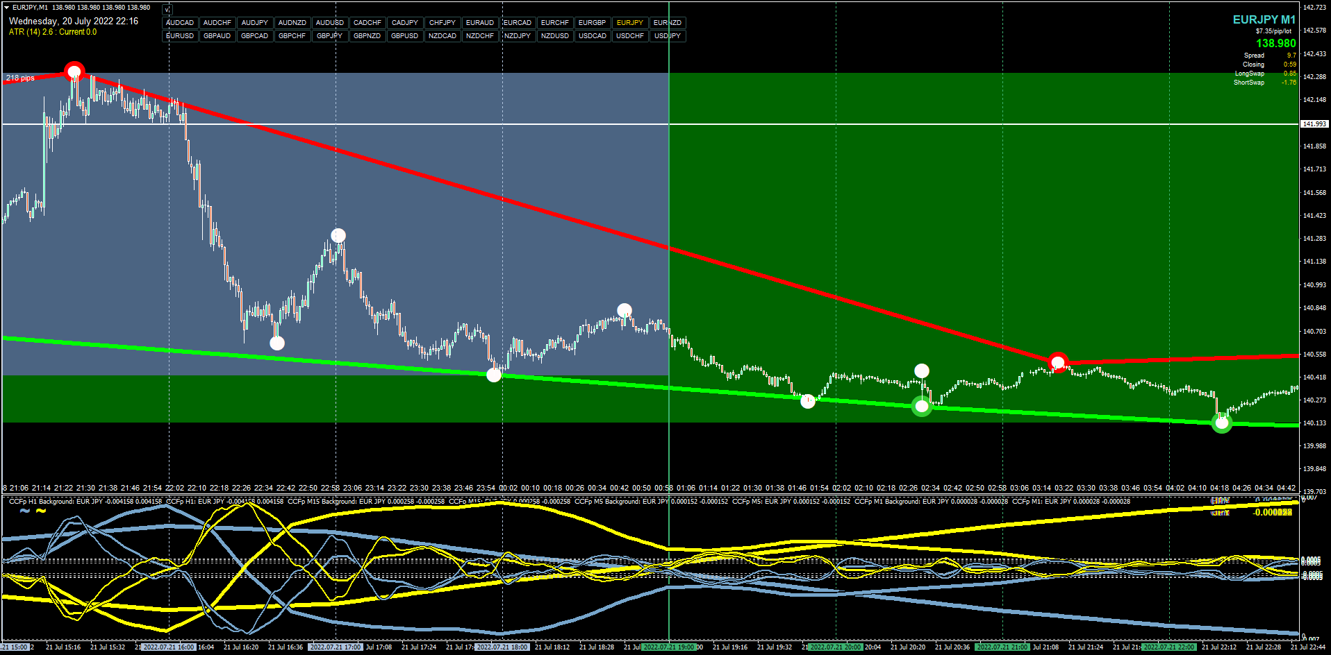 * I have been intrigued with the notion of currency slope strength since quite early in my self-guided study of forex trading, enamored with how the lines moved in response to price and what expansion / contraction / crossing of the lines meant for trading. I wondered how it would be possible to exploit market opportunities when certain currencies dominated in strength over others, or how to use the CCFp indicator in single-pair mode in a trade plan. Then the epiphany hit me to replicate this indicator multiple times on the chart and use its MTF capability to display the current timeframe and the next several timeframes above it as lines of varying thicknesses. The MANY hours that I've spent studying how they move in relation to each other because of price has become almost a way to view the market under ultraviolet light - it leads to seeing things that cannot be seen any other way. The problem that remains though is knowing exactly when to act on a trade based on CCFp lines. I knew I wanted to use them somehow, but was getting mixed results trying to trade them alone. So I've concluded: CCFp lines should never be taken alone as trade entry signals. Anytime I've won money by trying to predict them I was lucky, and more often I've lost money entering trades by trying to guess their future movement. This is because they don't pinpoint any clear candle on which to take entry, and the nature of MTF calculations causes their repainting-till-MTF-candle-close action in the present which doesn't exist in backtesting. Instead, CCFp lines are used to understand whether the market is gathering potential energy or springing forth with kinetic energy. The sum of their signals explains why price is where it is, and explains why trending or ranging is currently happening - but they alone won't tell you when to get into the market. If anything, they may suggest when NOT to trade, or they will inform your mindset over a trade you're already in and foreshadow conditions to suggest a trade exit.