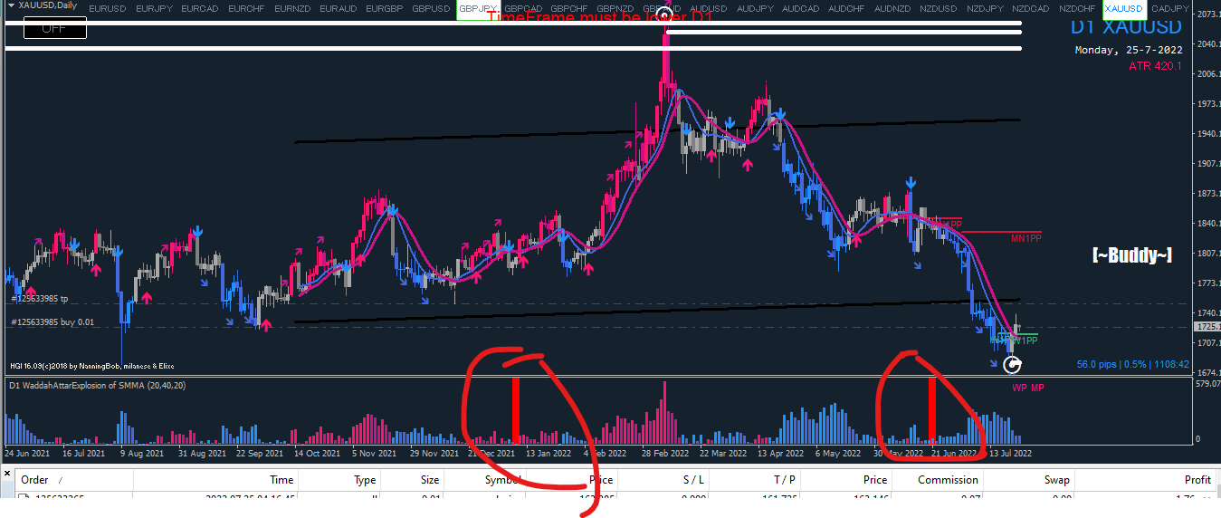 PumbaPLS: I have explained in page 1 what the WAE does.. again in very simple: small bars = little movement, big bars = a lot of movement. Colour direction = Trend direction. If you want to know something else then be more specific