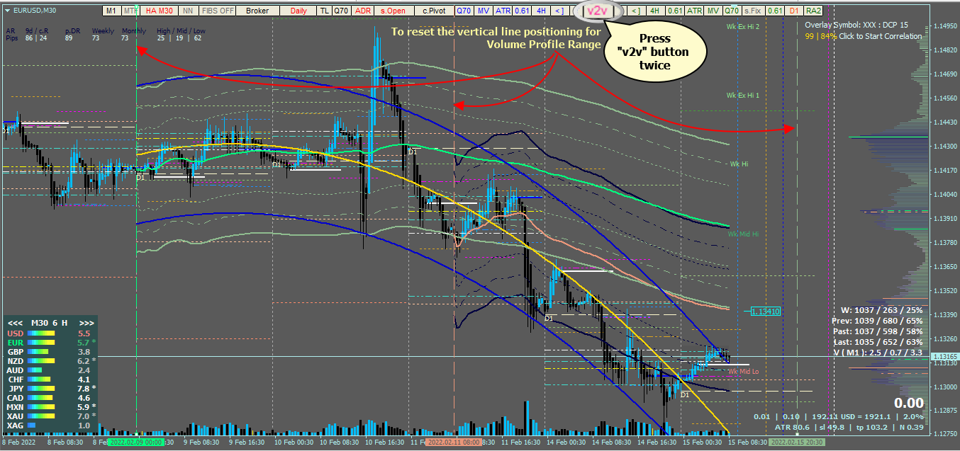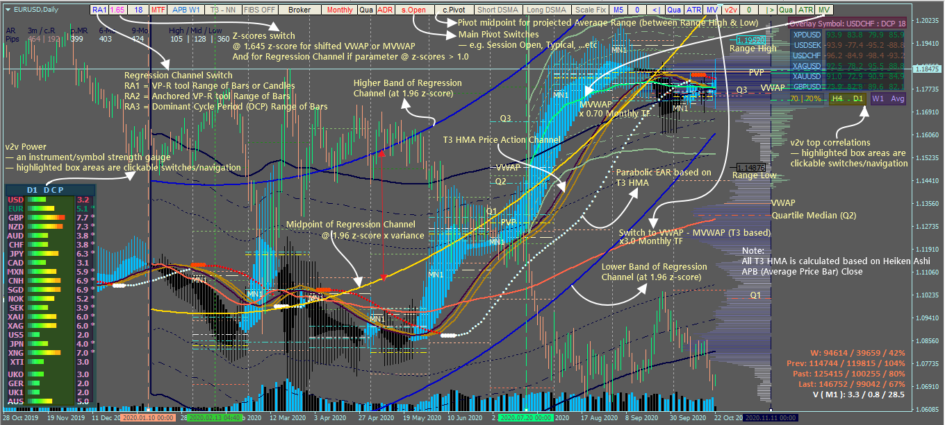 The statistical z-score value is getting injected inside an algorithm or as an option to be part of an equation for predicting trend-end probability. The vertical line guides on this system (from & to) are used for plotting from price inflection points or session ranges (4-hour, daily, weekly, and monthly or 8-hour or 24-hour market range). The setup included a feature that can switch from MVWAP (MA-based VWAP ) to classic VWAP. The MA (Moving Average) is a Hull MA non-lag fused using a Fulks Matulich way of calculation of a T3-based MA. As a result, I called it a T3-HMA.