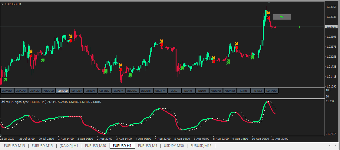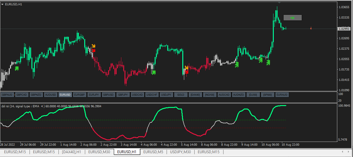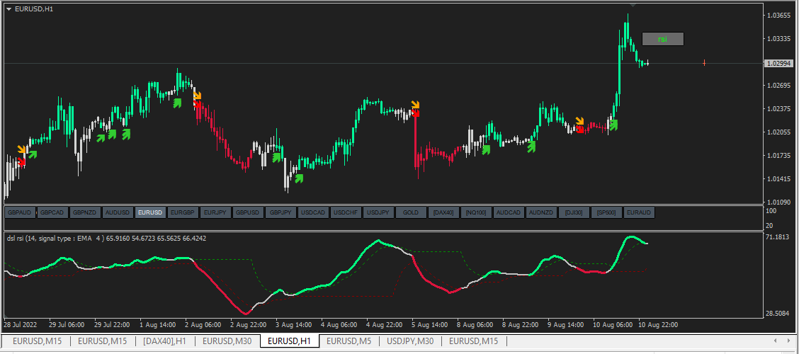 Coloring by slope of RSI, cross with signal and cross on levels(DSL or fixed)