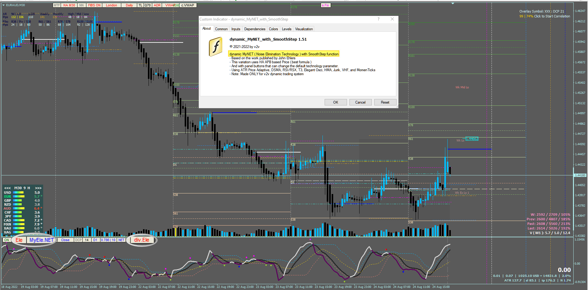 DCP-based period/length/bandEdge (dynamic), Datasource (M1/M5...M30), SmoothStep, and NET