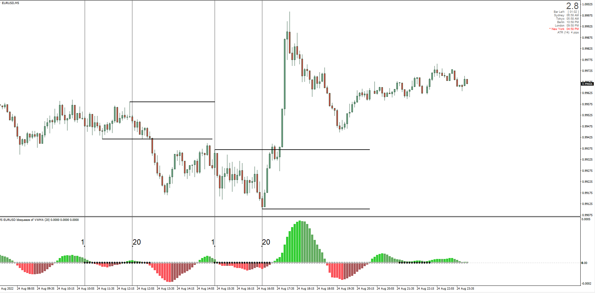 Would it be possible to add a count on the number of candle/black dot that formed the range? In addition, if the count is higher than 20 (variable) draw a trendline on the high and low of this period which stretches over 6 hours (variable).