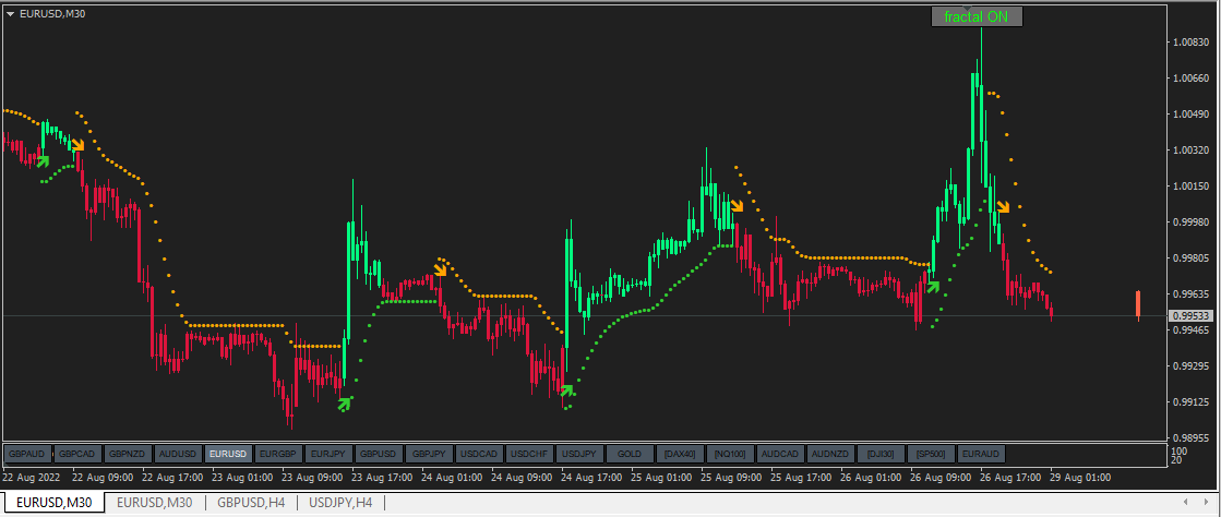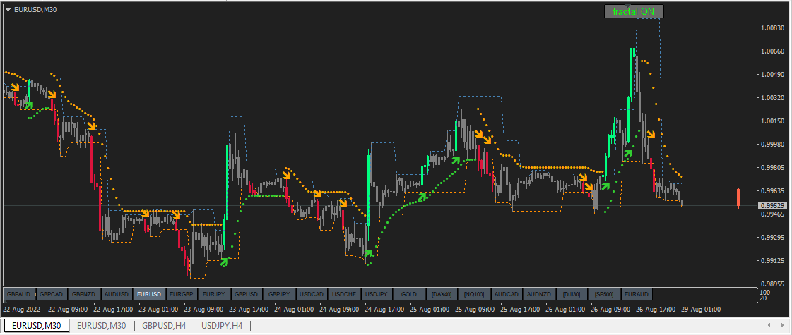 Trend envelop indicator is the lines and arrows are fractal breakout