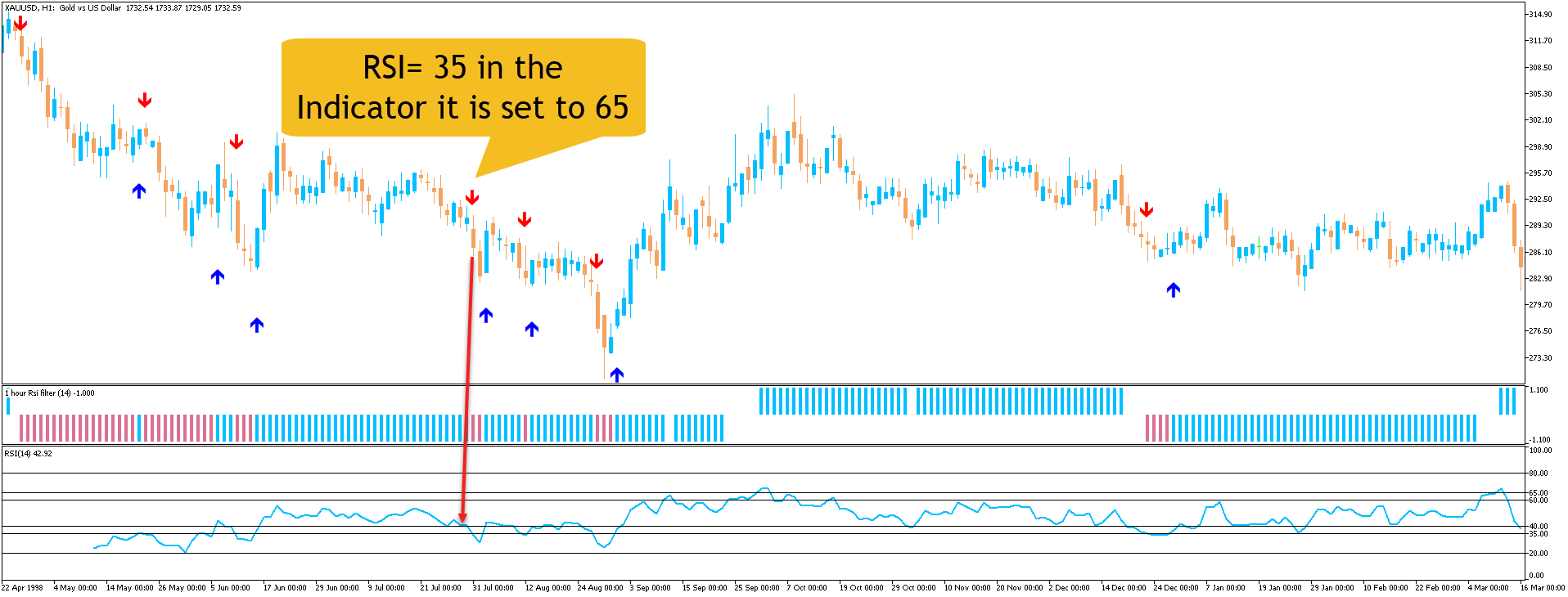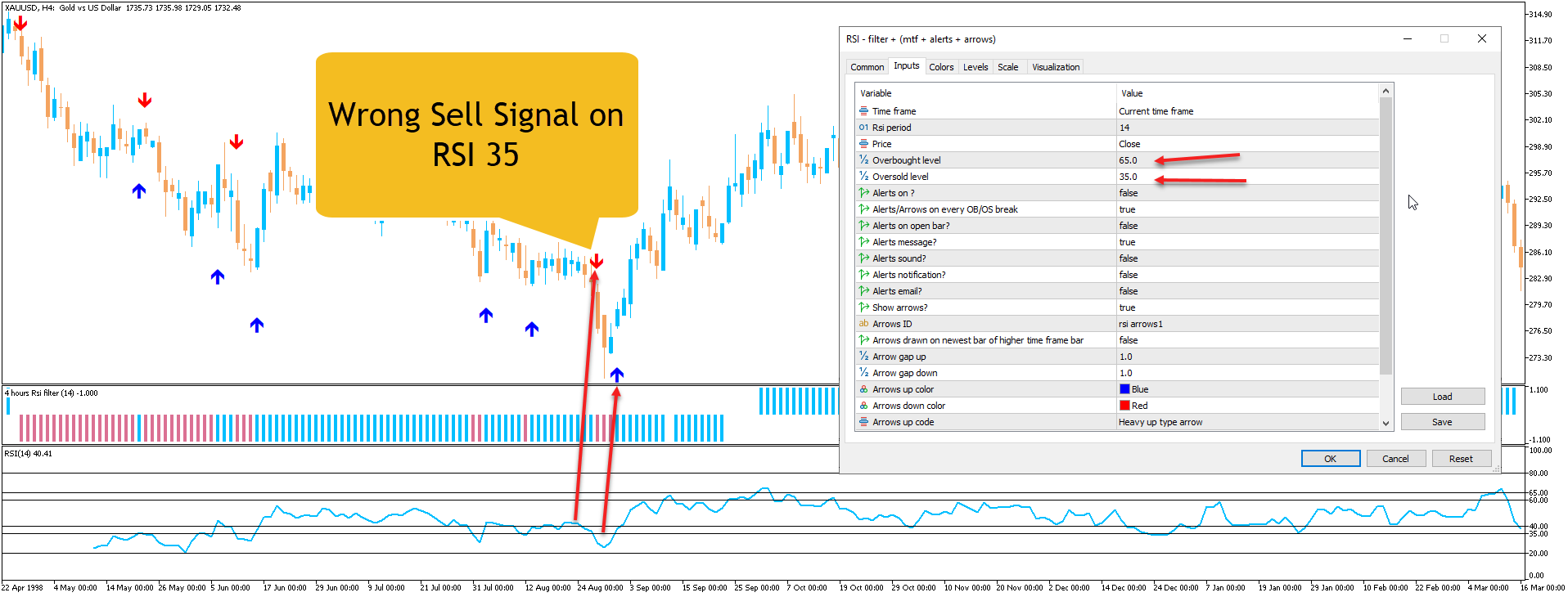 Can you please fix the bug if I drag the indicator on the chat with default RSI settings that is 65 and 35 it shows Sell and Buy (Overbought and Oversold) signals on on 35 Level. As you can see in the Chart attached. If I set to Overbought and Oversold levels to 60 by 60 then it will show you signals from 60-60 Levels. What is I want is If I set Oversold Level= 40 or 30 it should give signals from that level and for Overbought Level=60 if I set it shows signals on that level. Can you please fix?