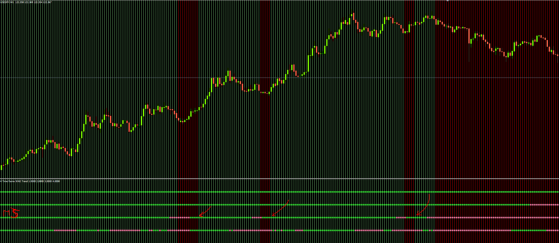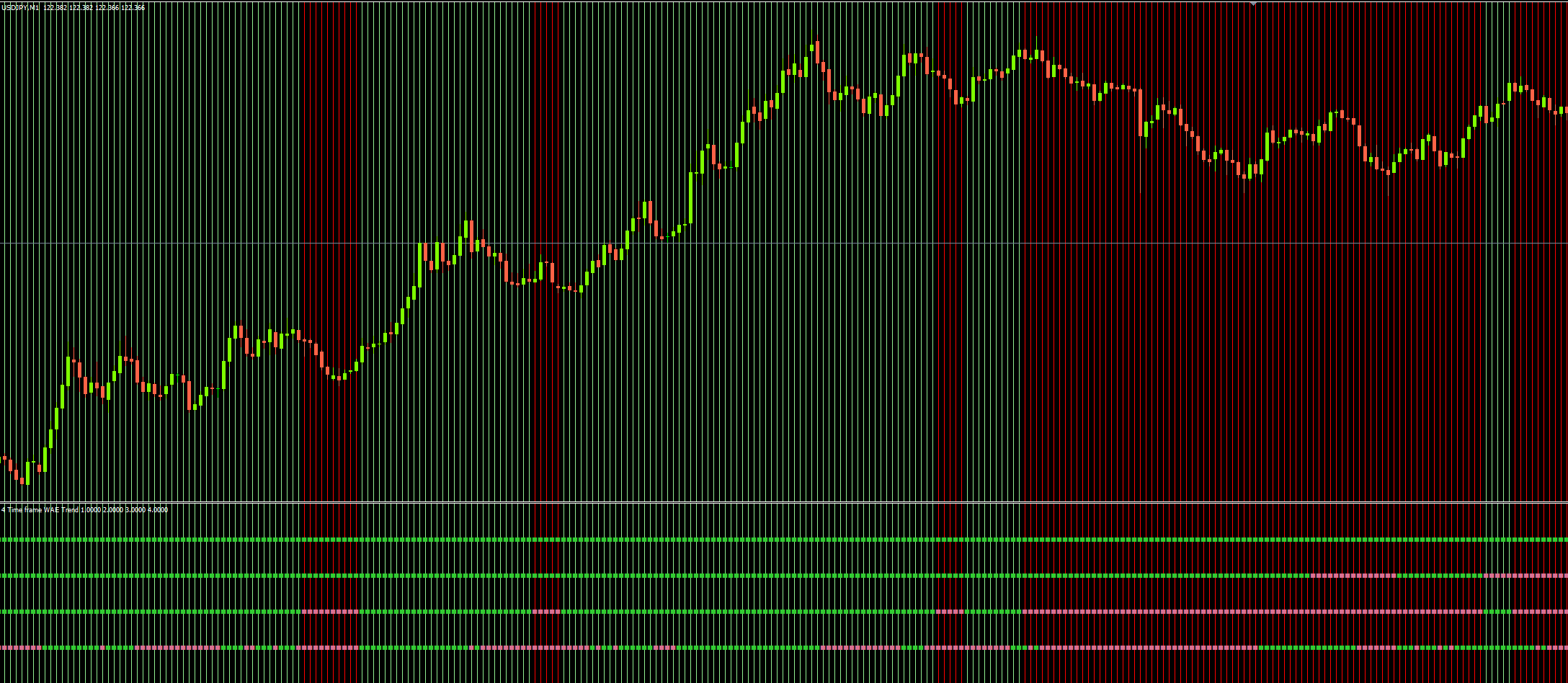 Using standard Waddah Attar Explosion I get the values of the indicator at higher timeframes, but shifted, for example, I draw vertical green lines when waddah m5 is long and vertical red lines when waddah m5 is short, look at the perfect shift in the image below: