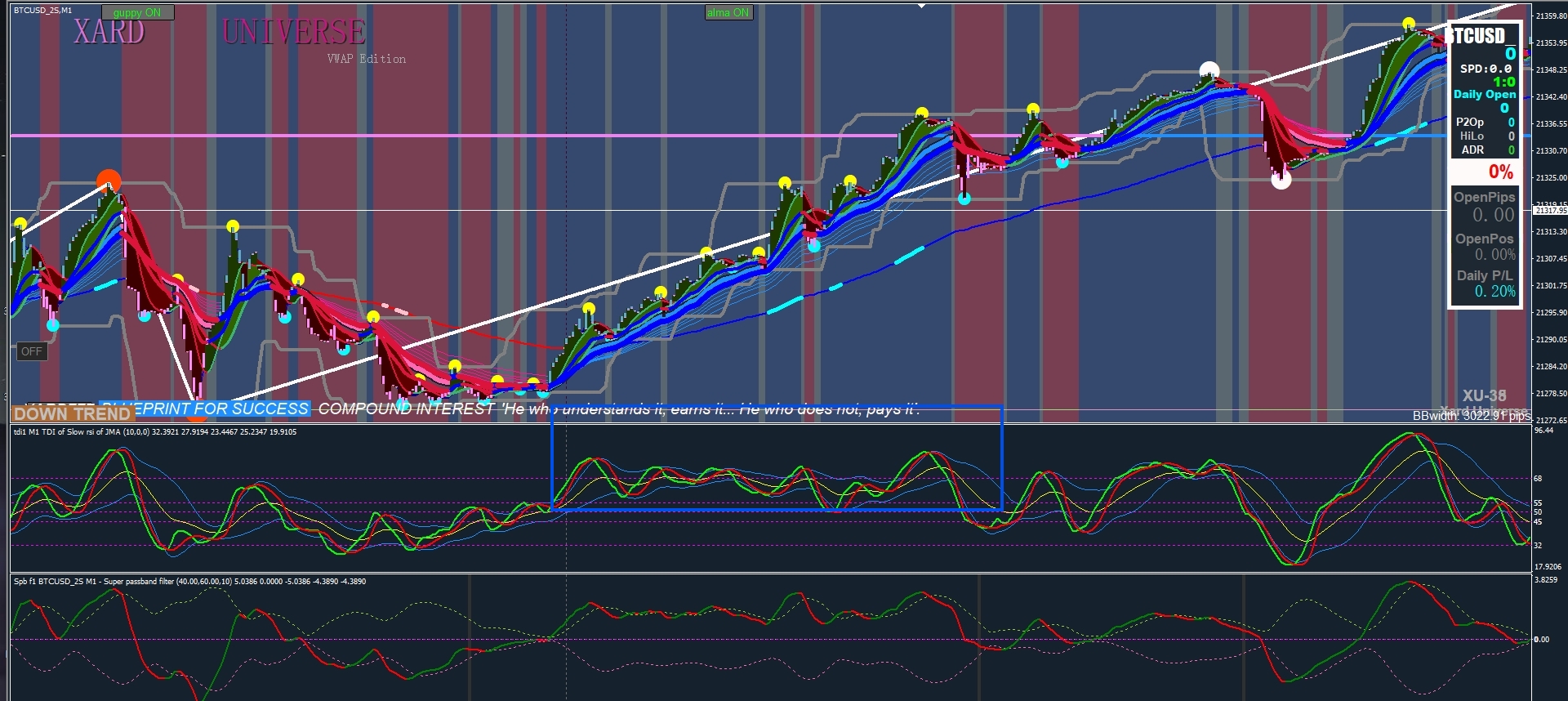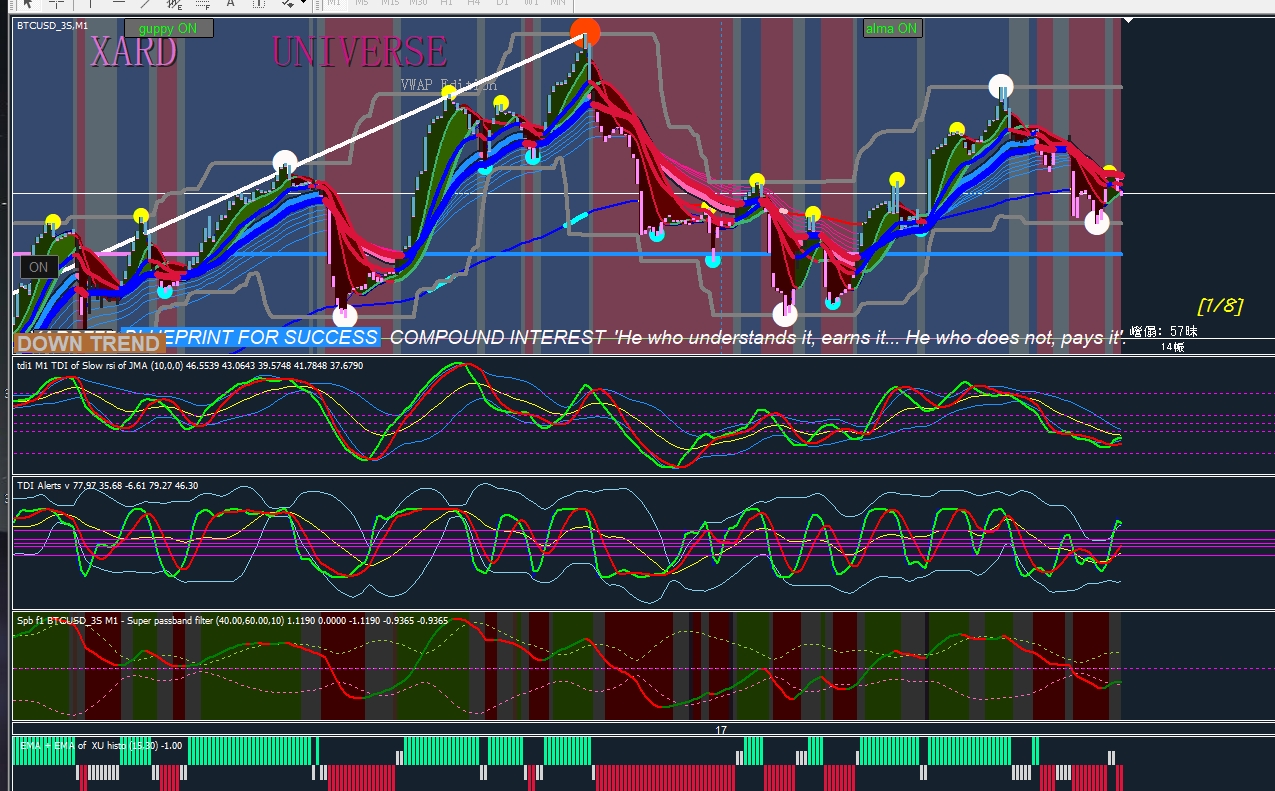 Create a text label and alert, whenever the yellow line goes down past 45, the text label displays DOWN TREND, and an alert sounds. WAITING