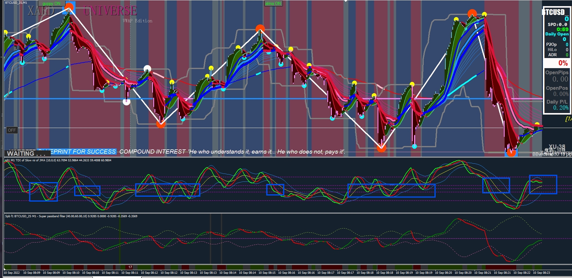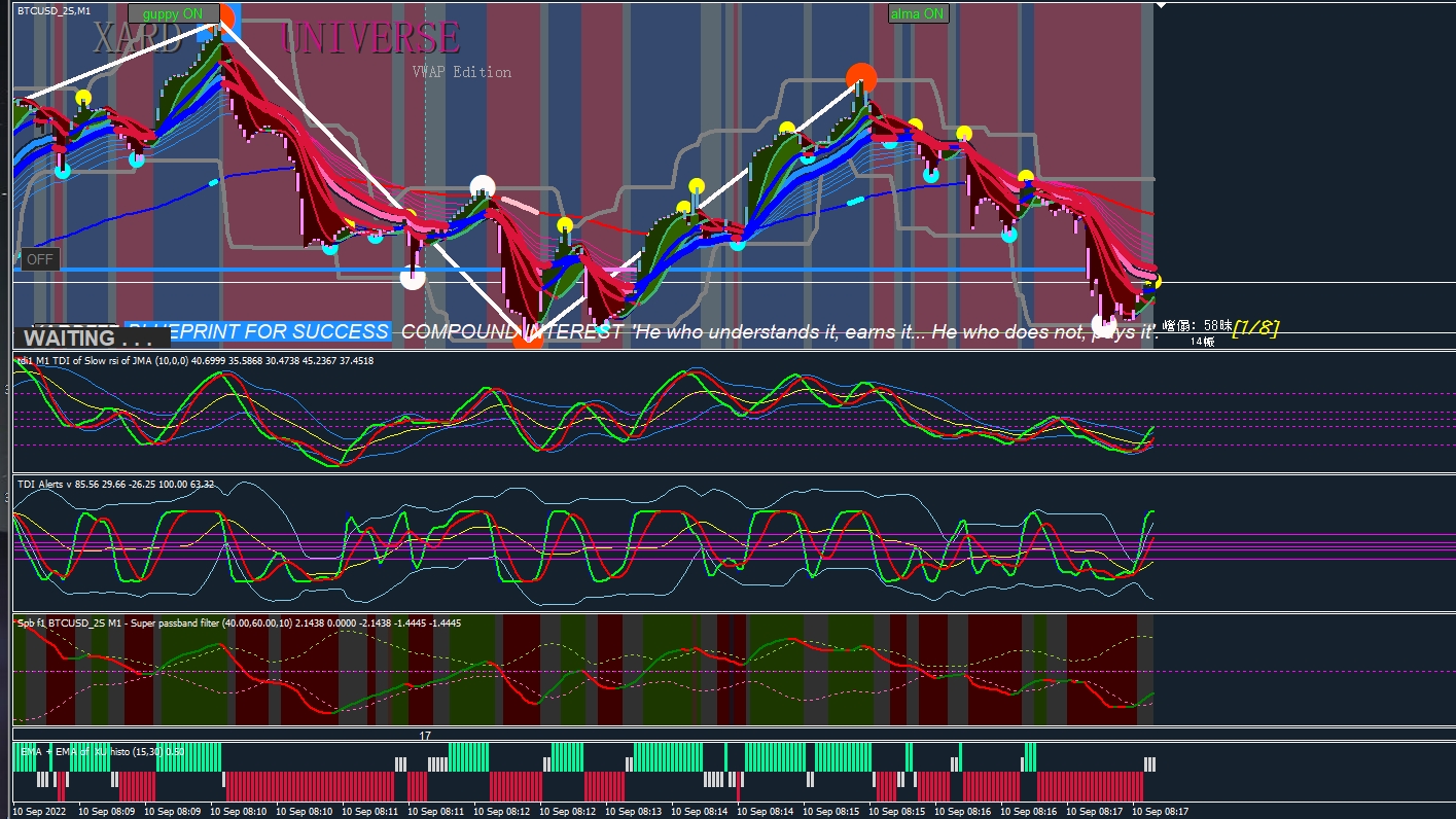 Create a text label and alert, whenever the yellow line is in the middle of 45-55, the text label displays WAITING, and an alert is issued. If you can help realize this idea.