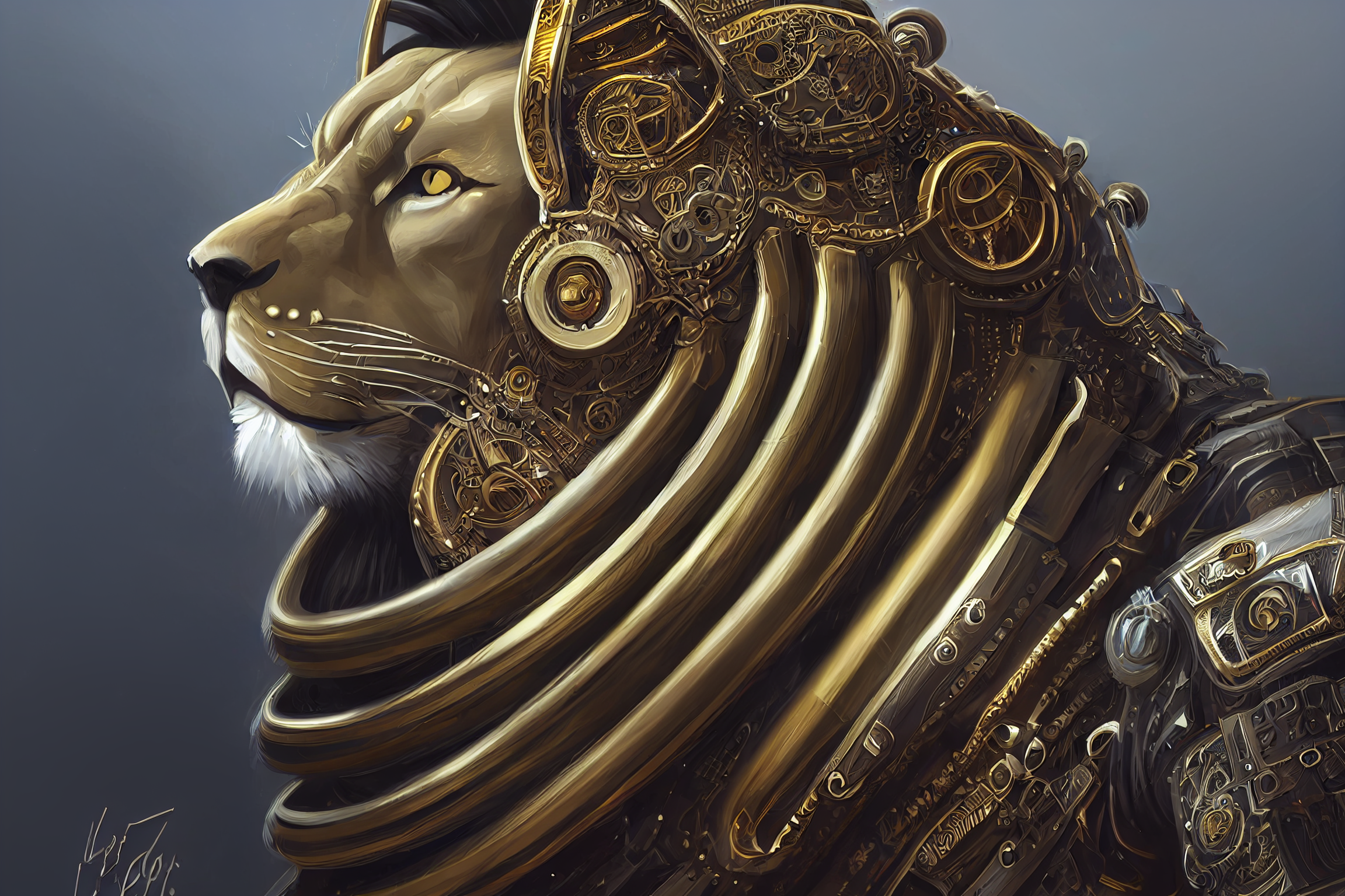 a portrait of a cyberpunk anthropomorphic male lion in a futuristic finely detailed armor, intricate gold filigree metal design, fantasy, elegant, highly detailed, digital painting, concept art, matte, sharp focus, golden ratio, illustration, art by Josan Gonzalez, artstation, 8K --ar 16:9 --test --creative --chaos 50 --seed 100000001 --upbeta