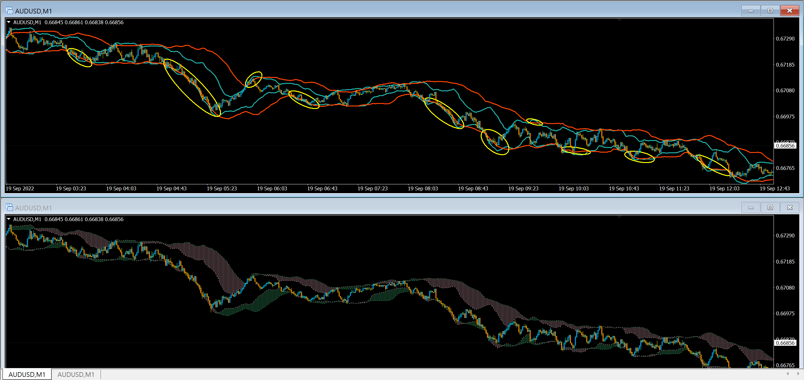 if you look in the picture it's a down trend, so just by looking for the moments in which both "Fast BB" are below the "Slow BB" yu can see that were the moments when the pair get stronger movements, of course not every time the setup act as a filter will be a signal, but still it cold give some better filtering that for example a BB stops alone since the BBstops will just make a change when the price touch the other BB, while with this it will keep showing a trend for as long as the both "fast bb" are wither above or below the "slow bb"