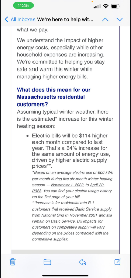 National Grid of Massachusetts just announce their winter generation charge. Up 22.4 cents/KWh to 33.9 cents/KWh. All in thats 47.9 cents/KWh including the 14.0 cent/KWh delivery charge. Probably close to what Europe will be charging this winter.