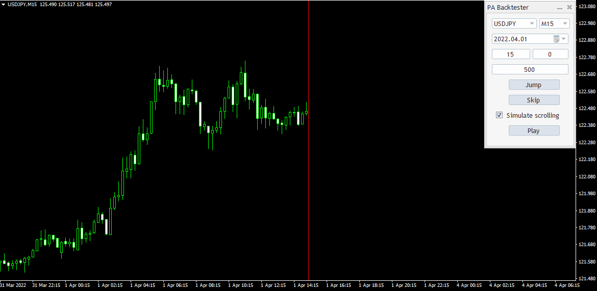 Below that, select the date that reproduces the price movement and click "Jump" to switch the chart to the specified currency pair/time frame and date and switch to verification mode.