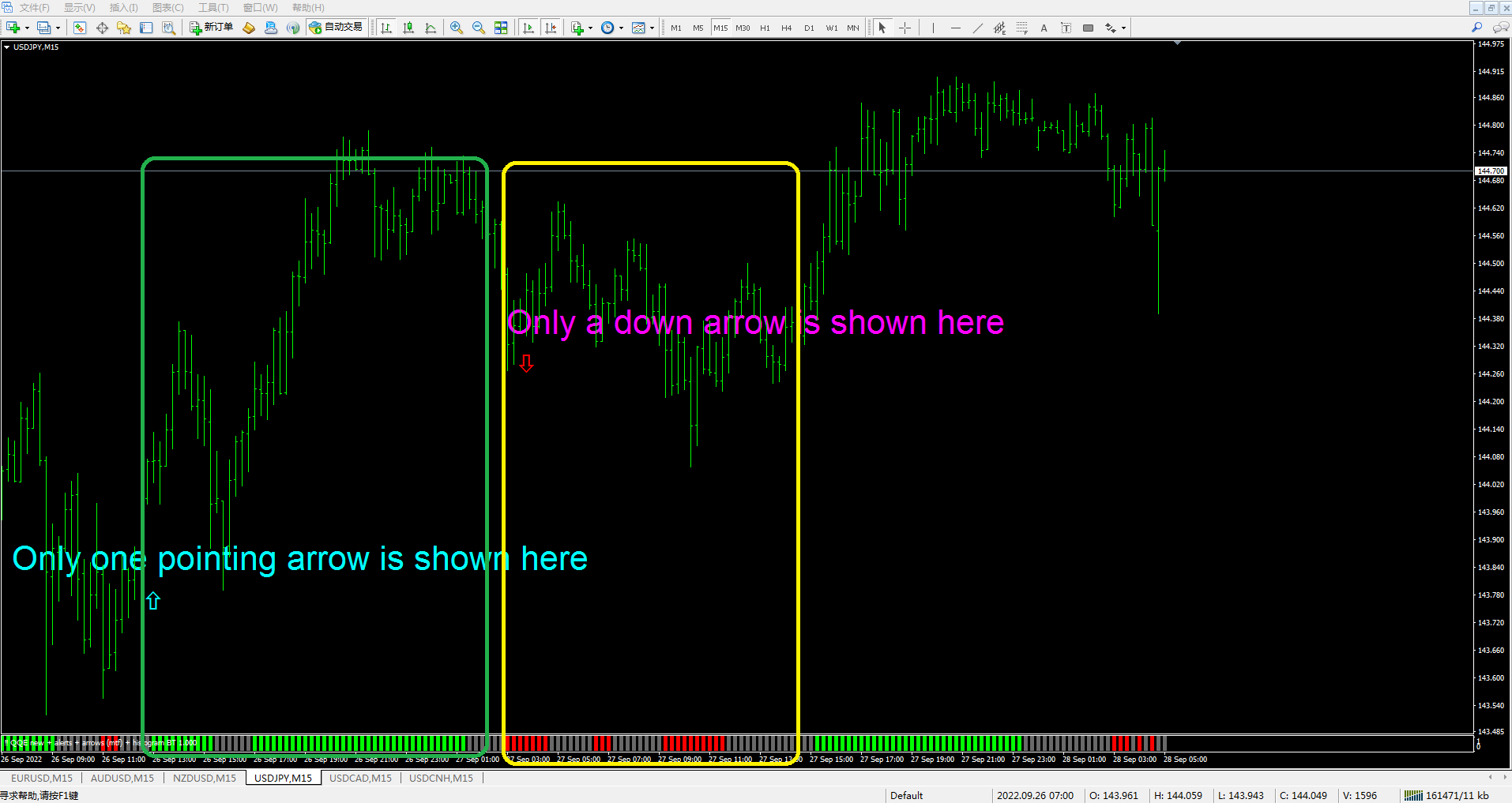 As shown in the figure, only one arrow is displayed for each wave of market (that is, only one upward arrow is displayed in the upward market, and only one downward arrow is displayed in the downward market).