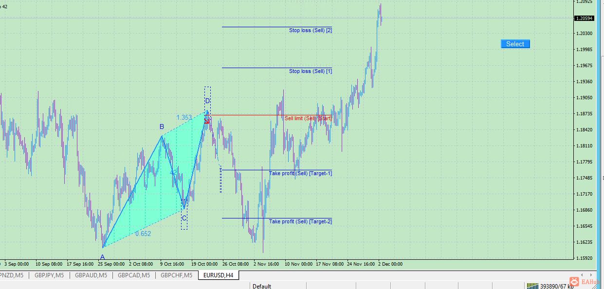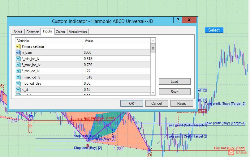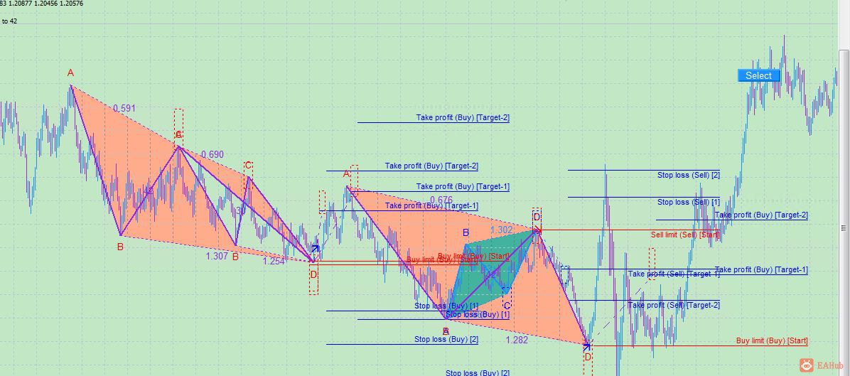 The indicator scans all possible combinations on the chart for the current moment, and also in history, with the help of specifically designed tracing algorithm. If a pattern is not formed yet, the indicator plots a possible (predicted) ABCD pattern. Once the price reaches the D vertex of the predicted pattern, it becomes fully formed. Thus, all the ABCD patterns, as well as their possible variants, that meet the parameters specified in the settings, will be highlighted.